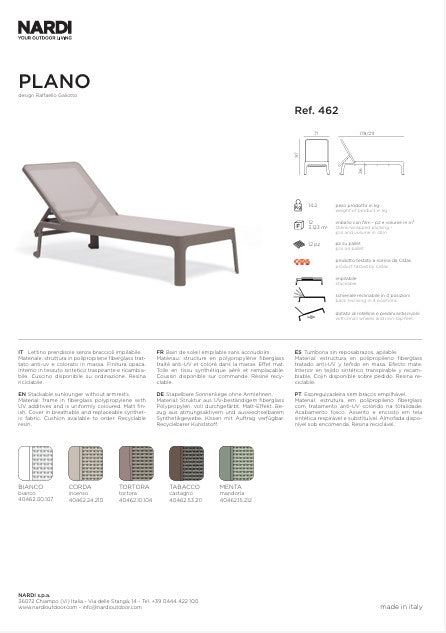 Le transat Nardi Plano est la solution idéale pour aménager piscines, jardins, terrasses, stations balnéaires et établissements hôteliers avec un style moderne, épuré et professionnel . Ses lignes harmonieuses et sa grande surface confortable garantissent une détente optimale en plein air.