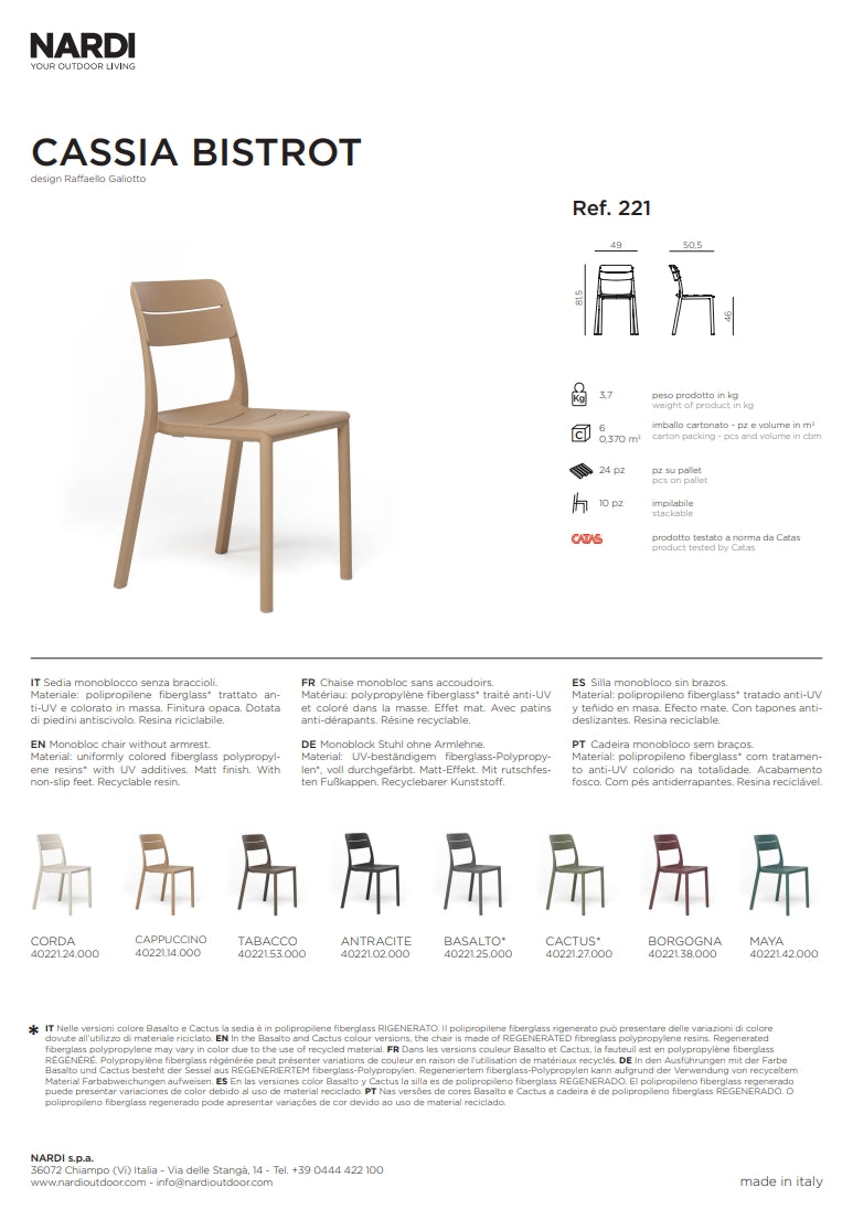 Les variantes Basalto et Cactus de la chaise Cassia Bistrot sont fabriquées en polypropylène renforcé de fibres de verre régénéré , dérivé de plastique recyclé, ce qui leur confère une résistance et une durabilité élevées.