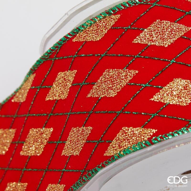 Ruban Noël EDG Enzo De Gasperi, motifs carrés, hauteur 65 mm, longueur 10 m, vert et rouge.