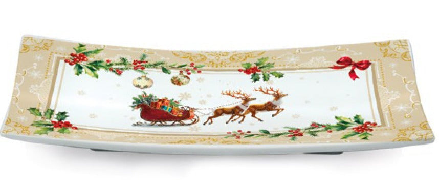 Confectionnée en porcelaine décorée , cette assiette présente une magnifique scène de Noël avec le Père Noël dans son traîneau tiré par ses rennes , le tout encadré de décorations de houx, de nœuds rouges et de détails dorés. Idéale pour servir des douceurs, des biscuits ou des amuse-gueules pendant les fêtes.