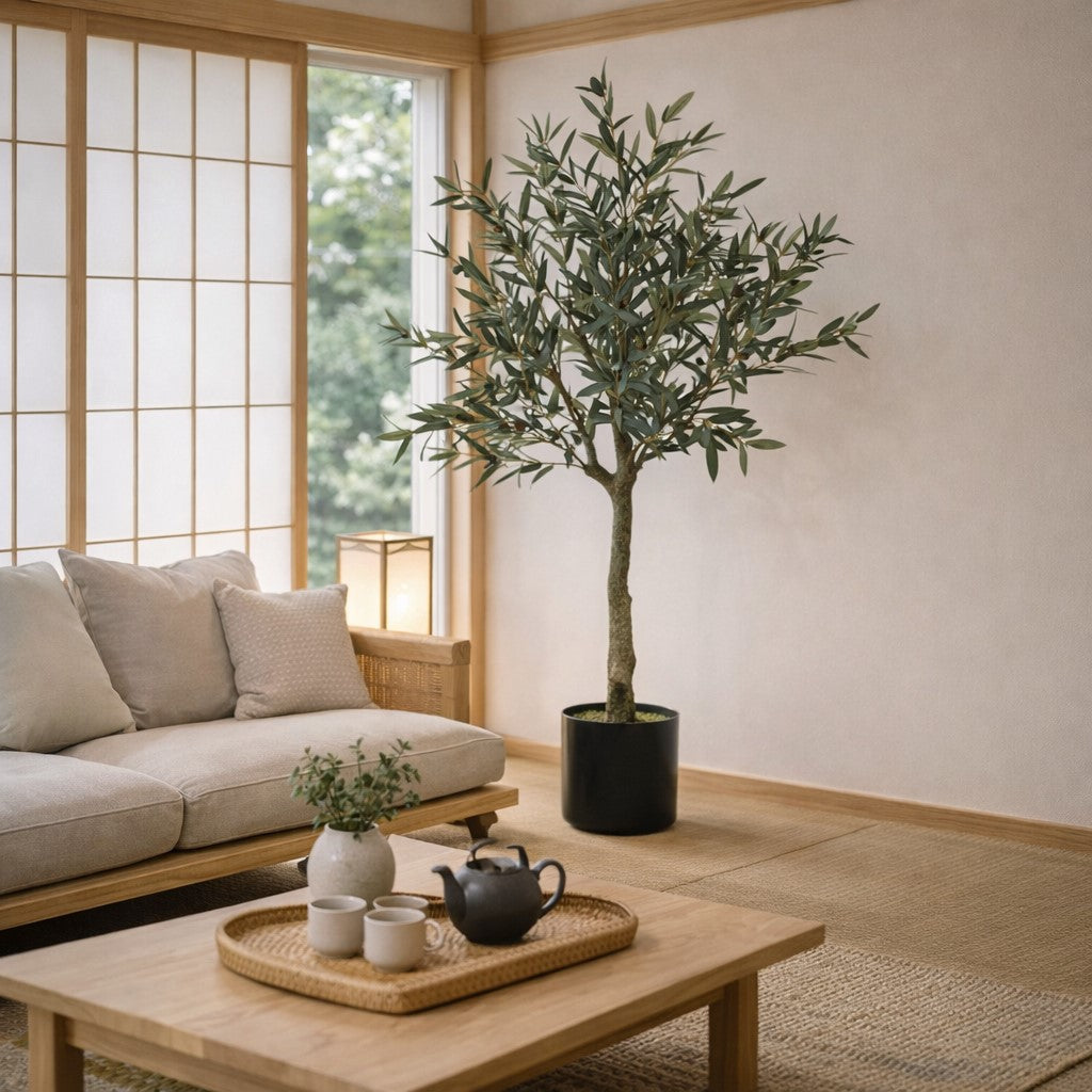 La chioma ricca di foglie verde oliva e il tronco realistico, lavorato nei dettagli, riproducono fedelmente l’aspetto dell’olivo naturale, regalando un effetto armonioso e raffinato. Ideale per soggiorni, ingressi, uffici, reception, boutique e ambienti contract.
