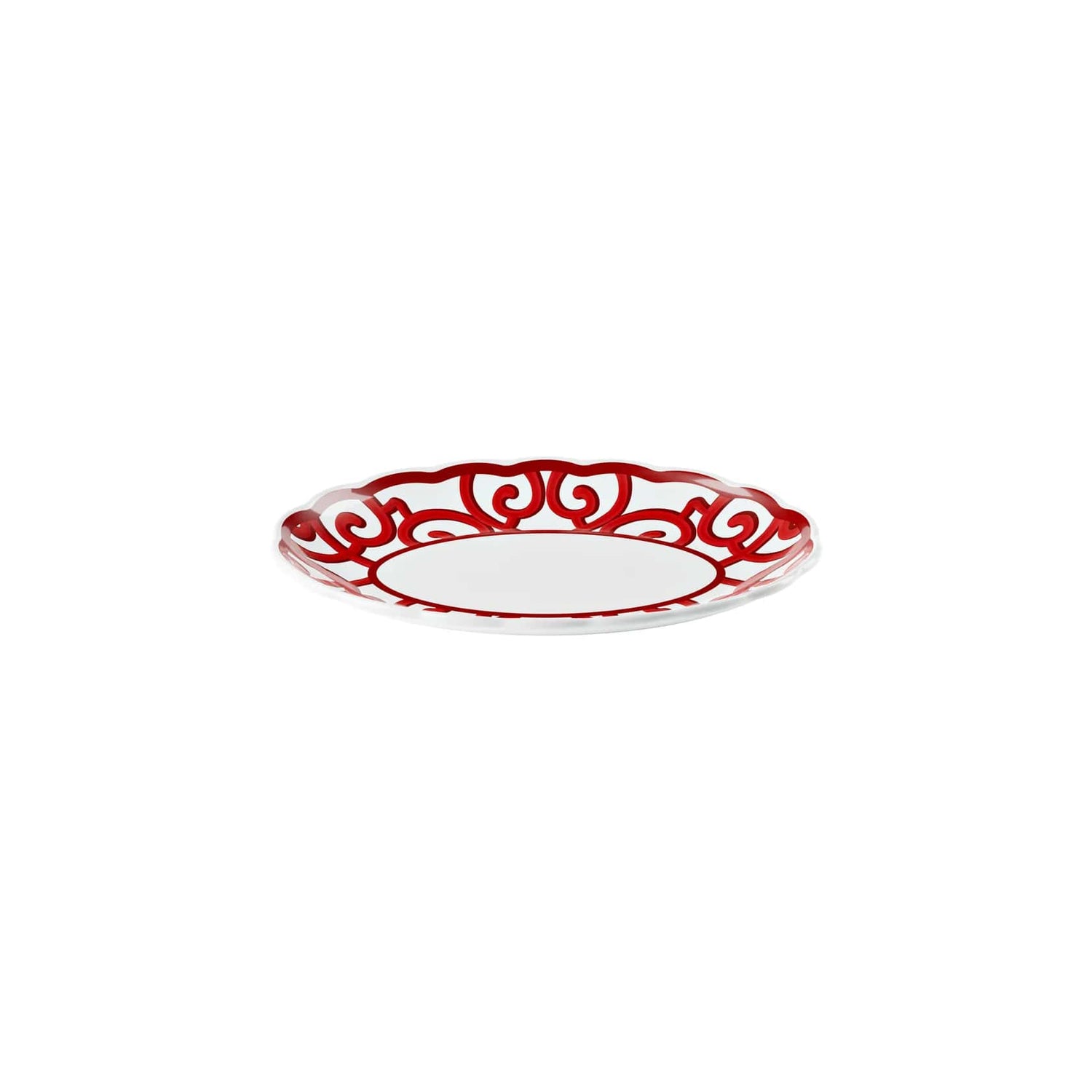 Apportez l'élégance des fêtes à votre table avec le petit plateau ovale Harmonia de Guzzini , fabriqué en mélamine de haute qualité avec des décorations rouges raffinées sur fond blanc .