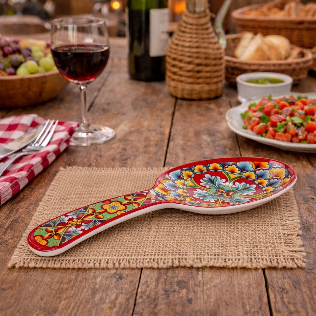 Fabriqué en mélamine de haute qualité , ce repose-cuillère est résistant aux chocs, léger et facile à nettoyer , ce qui le rend idéal pour un usage quotidien. Son design rouge et bleu , inspiré de la tradition méditerranéenne, apporte une touche de dynamisme et d'originalité à votre cuisine.