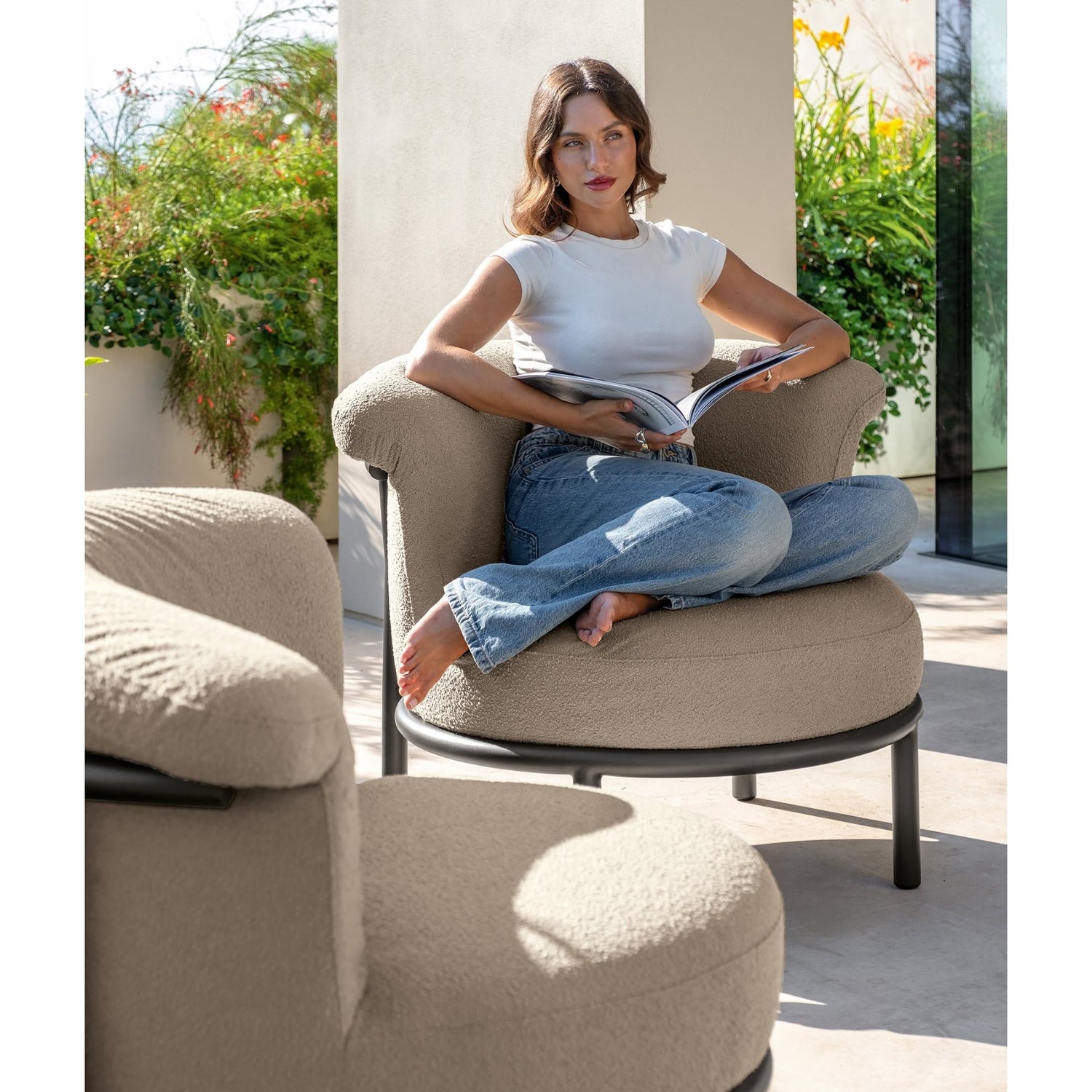 Sa structure en aluminium peint couleur moka, à la fois robuste et légère, supporte de généreux coussins accueillants , conçus pour un confort optimal et des proportions harmonieuses. La teinte moka renforce le lien avec la nature, ce qui la rend idéale pour les terrasses, les jardins et les élégantes vérandas.
