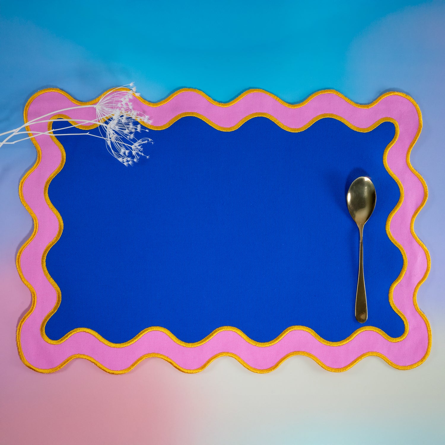 Confectionnés en coton de qualité , ces sets de table sont doux, résistants et réutilisables, parfaits au quotidien comme pour les occasions décontractées, les brunchs, les apéritifs ou les dîners entre amis. L'association d' un bleu profond et d'un rose délicat , rehaussée d'un liseré moutarde, crée un équilibre de couleurs moderne et raffiné, idéal pour les intérieurs contemporains et créatifs.