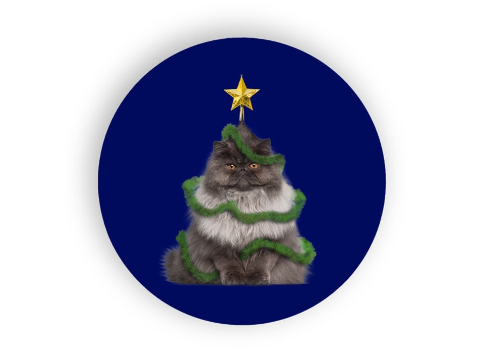 Le protagoniste est un adorable chat déguisé en sapin de Noël , avec une guirlande verte et une étoile dorée à son sommet, sur un élégant fond bleu nuit.