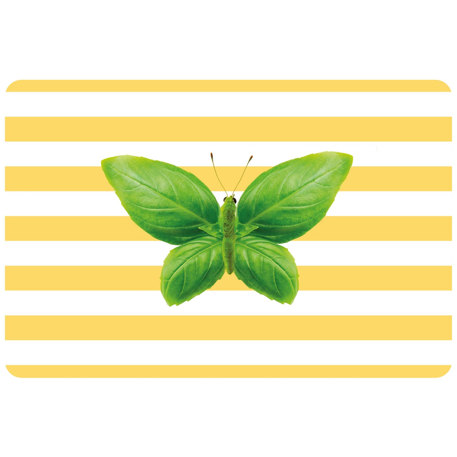 Le recto, orné d'un imprimé artistique façon collage représentant un papillon composé de feuilles vertes sur un fond à rayures jaunes, crée un effet frais et naturel, tandis que le verso gris uni offre une alternative plus sobre et élégante. Un set de table polyvalent, fonctionnel et décoratif, idéal pour ceux qui aiment changer de style en un clin d'œil.