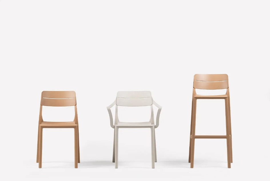 The Cassia Bistro chair in Cappuccino combines comfort and warmth in a simple, modern design. Armless, stackable, and durable, it's perfect for refined restaurants, verandas, or outdoor living spaces.