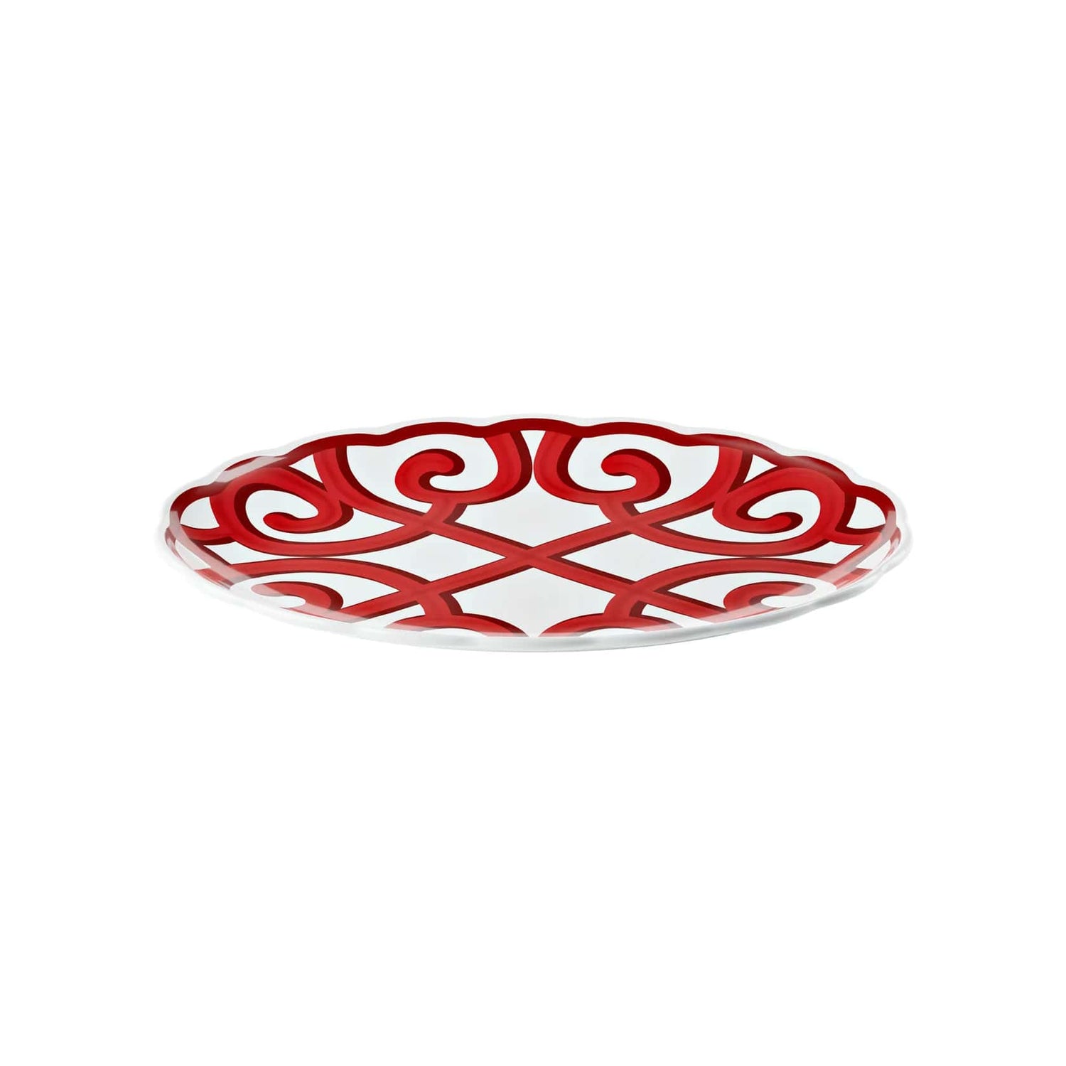 Add a touch of elegance to your table with the large Harmonia oval tray by Guzzini , made of high-quality melamine and decorated with refined red patterns on a white background .