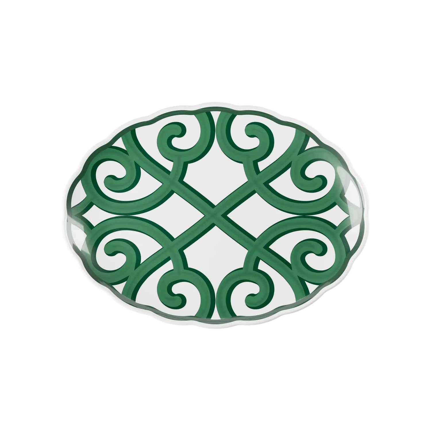 Refinement and practicality meet in the Guzzini Harmonia Large Oval Tray , an elegant creation in high-quality melamine with green decorations on a white background , designed to bring style and harmony to your festive table.