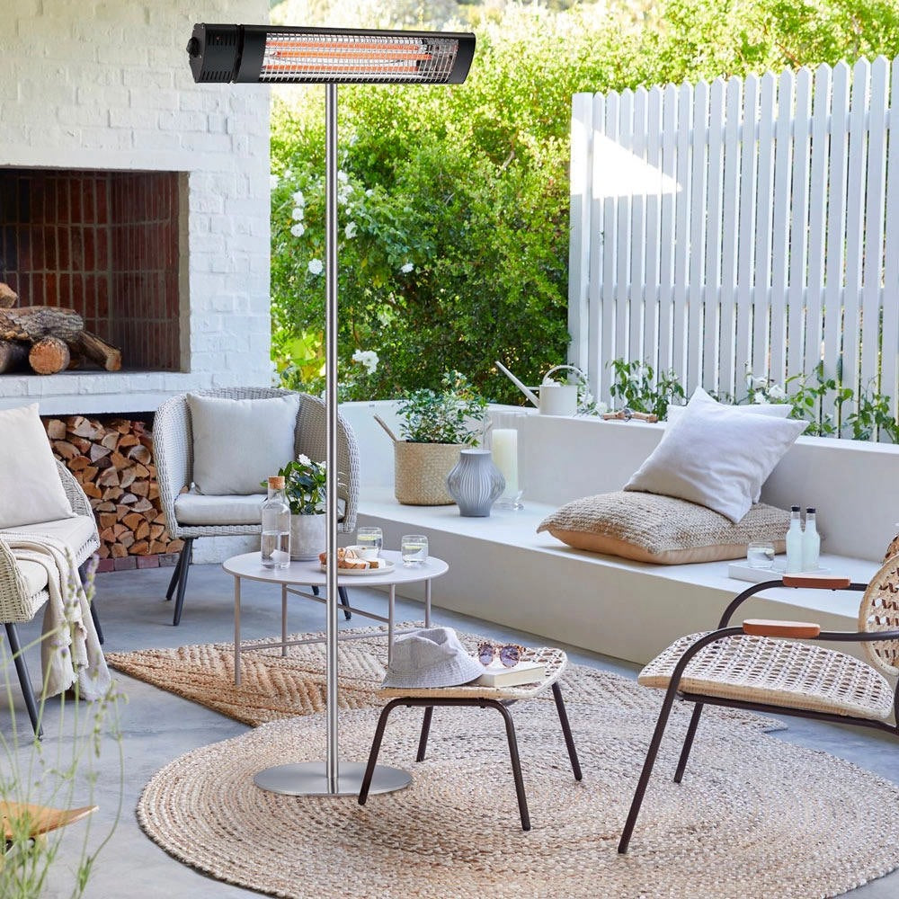 Infrared heater on pole has a working life of 6000 hours, including remote control.