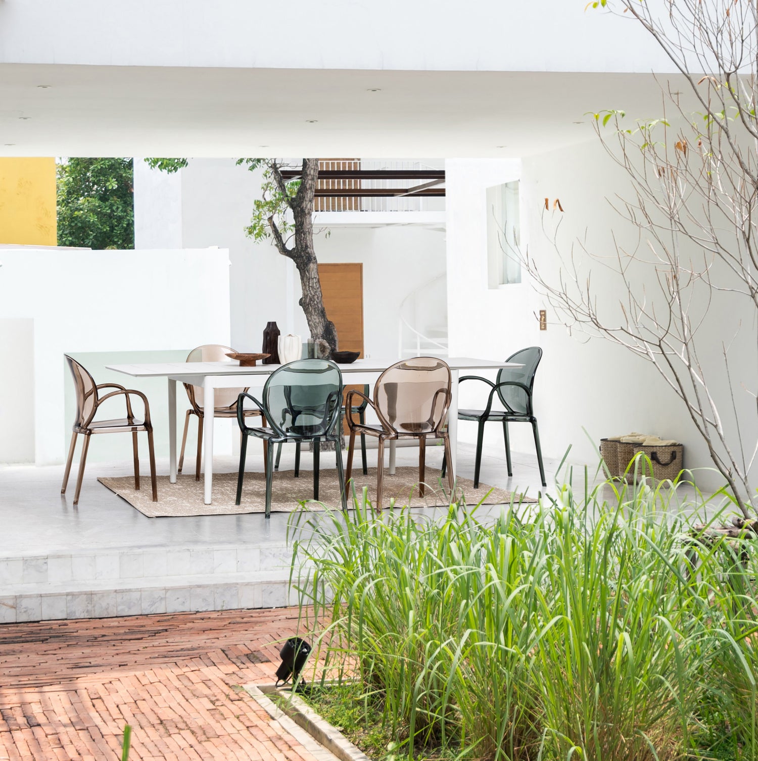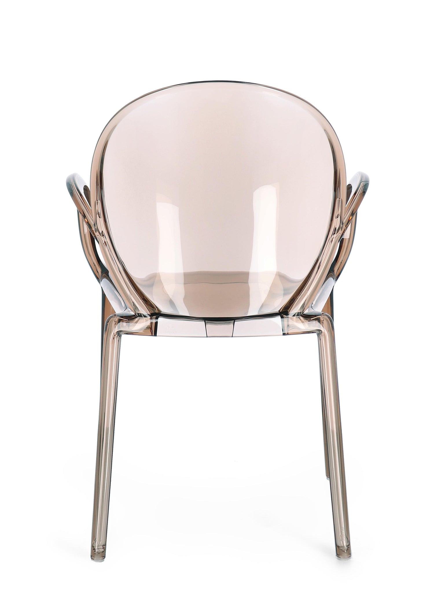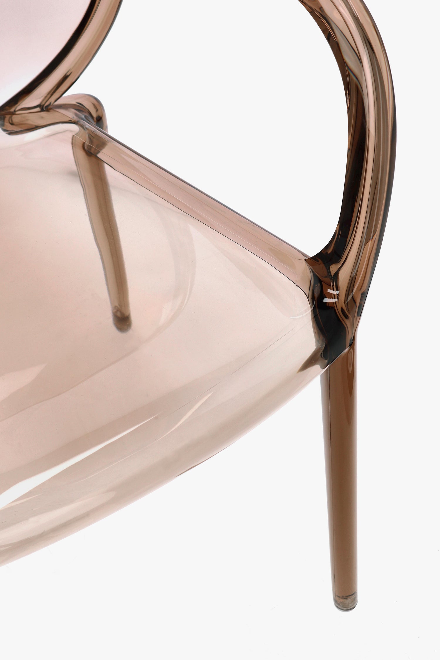 The transparency of the material, combined with the warm shade of coffee, enhances spaces without weighing them down. The integrated armrests and ergonomic seat offer comfort, while the stackable architecture enhances its versatility, even in contract or hospitality environments.