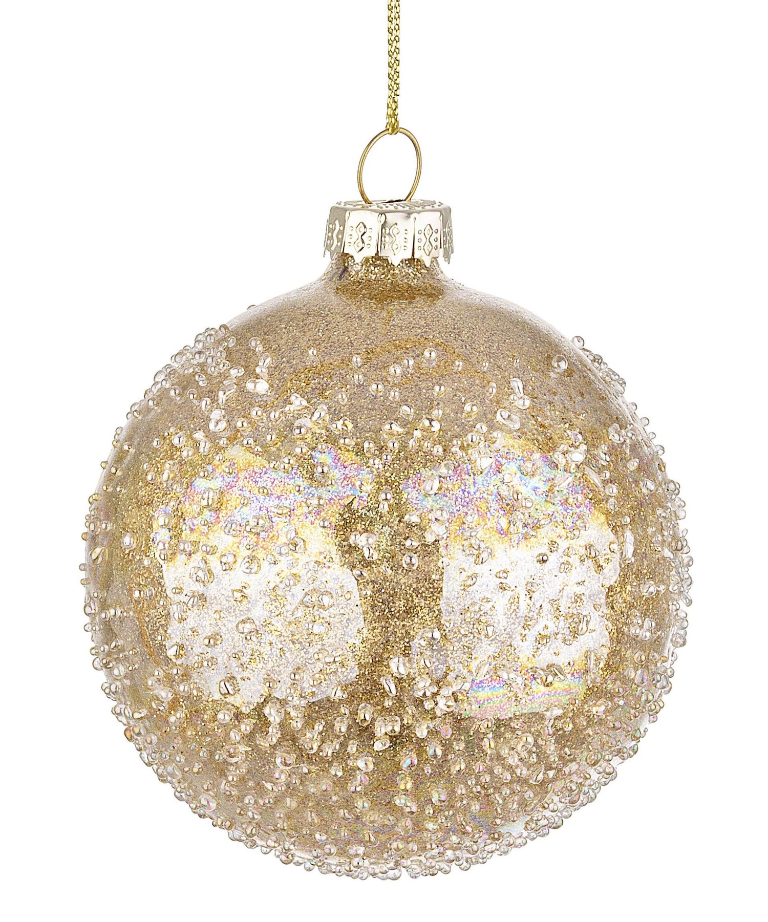 La boule de Noël Saturno de 80 mm de Bizzotto en verre doré est l'ornement idéal pour sublimer votre sapin avec style et élégance. Ses finitions scintillantes et ses perles en relief créent des reflets uniques, pour un effet précieux et raffiné.