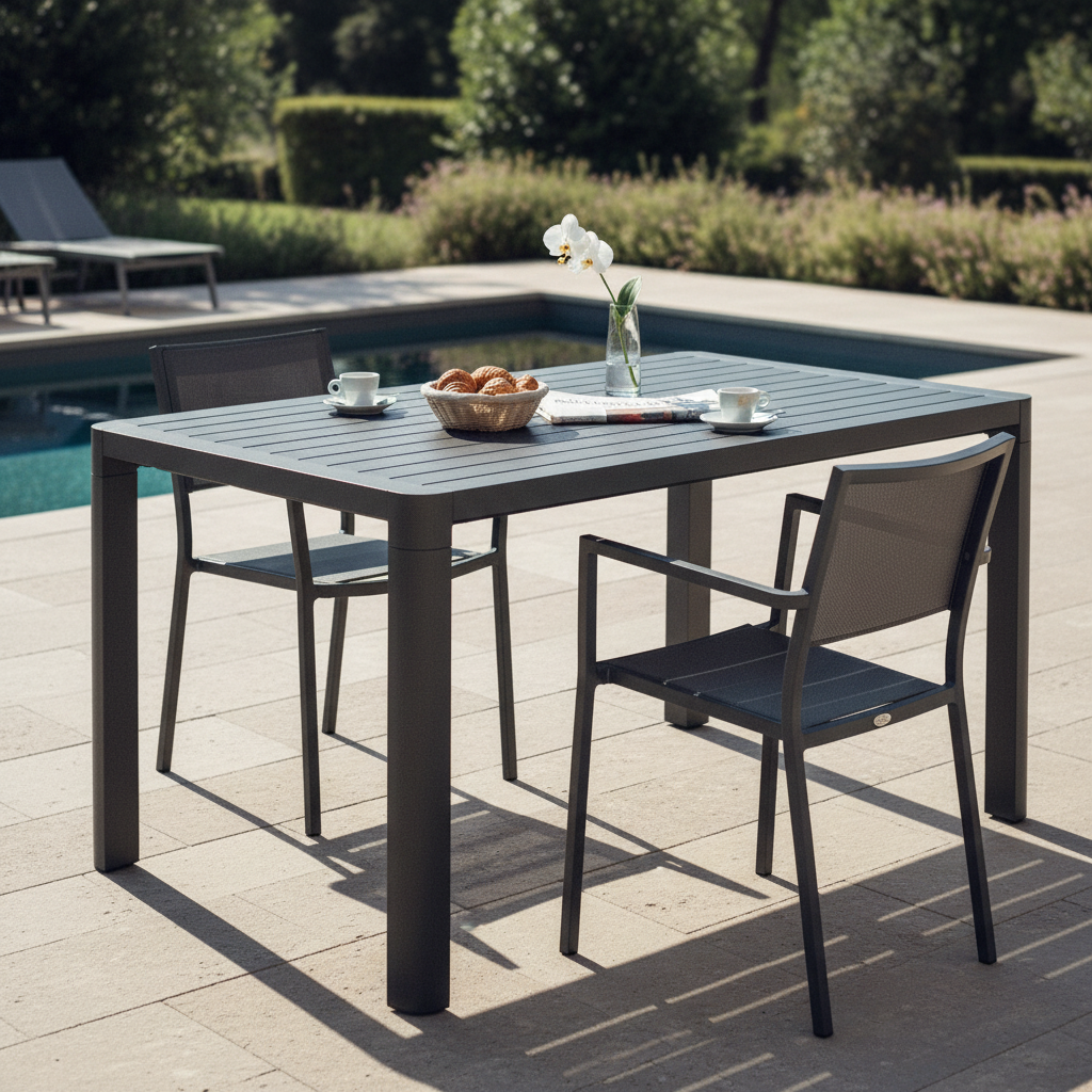 La table extensible Bizzotto Kiplin transforme chaque espace extérieur en un lieu convivial prêt à accueillir jusqu'à 10 personnes, grâce à son ouverture télescopique silencieuse et à sa structure en aluminium thermolaqué résistant aux intempéries. Idéale pour ceux qui recherchent une table de jardin extensible de qualité contract sans renoncer au design minimaliste.