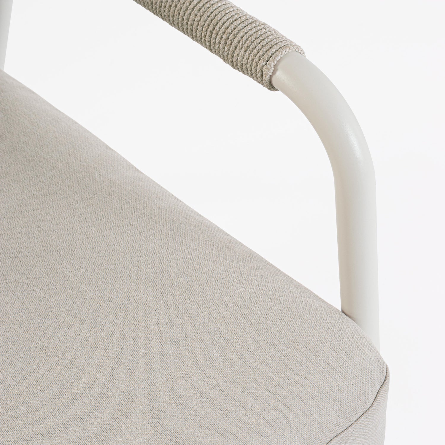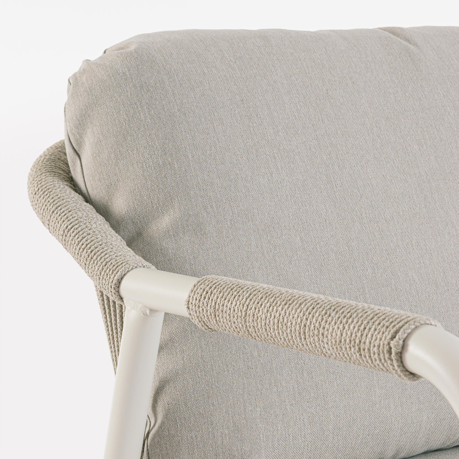 Nettoyer la structure en aluminium avec de l'eau et du savon neutre, sécher immédiatement pour éviter les auréoles. La corde en polyester se nettoie avec de l'eau tiède et du savon neutre — éviter l'eau de Javel. Les housses de coussins sont déhoussables et lavables. Le plateau en pierre frittée se nettoie avec un chiffon humide et un détergent neutre ; pas d'acides ni d'abrasifs. En fin de saison, couvrir avec une bâche imperméable ou ranger à l'intérieur.