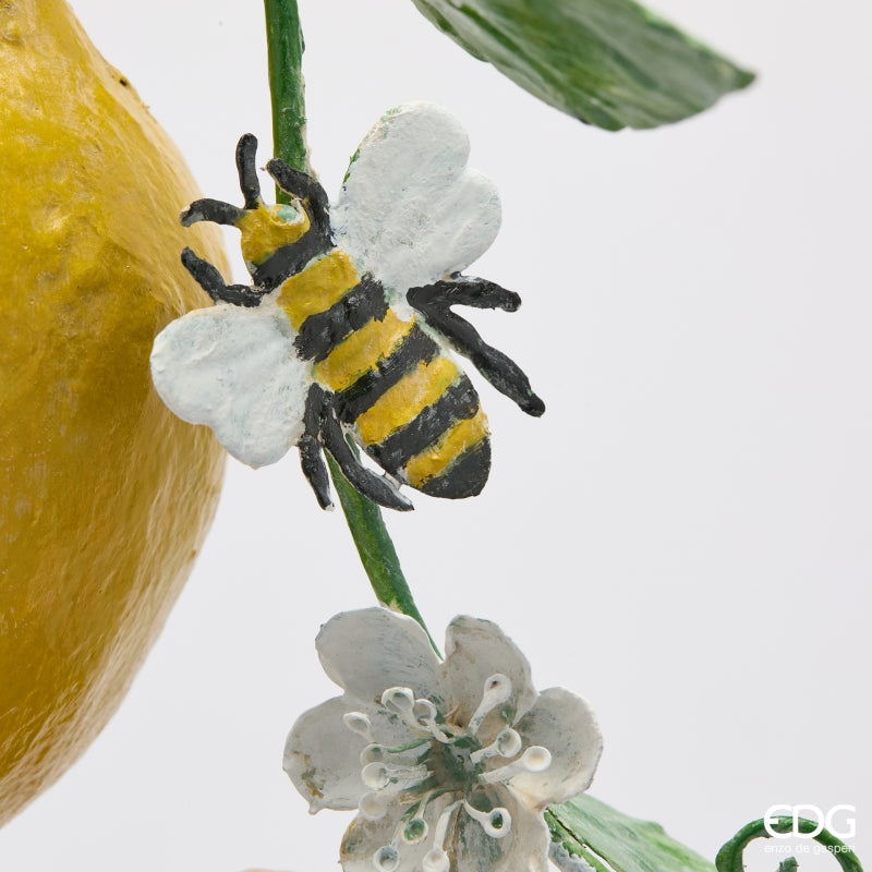 Decorazione sospesa dallo stile mediterraneo, impreziosita da dettagli floreali e ape decorativa. Realizzata in metallo e ferro con finitura materica effetto artigianale, presenta limoni gialli, foglie verdi e piccoli fiori bianchi che richiamano la fioritura degli agrumi.