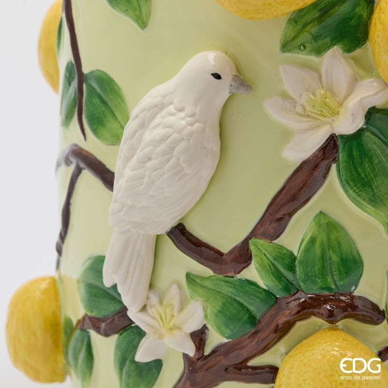 Vaso decorativo in ceramica con lavorazione artigianale e applicazioni tridimensionali di limoni, foglie e rami in rilievo. La forma bombata esalta il decoro mediterraneo, rendendolo un complemento d’arredo scenografico e raffinato.