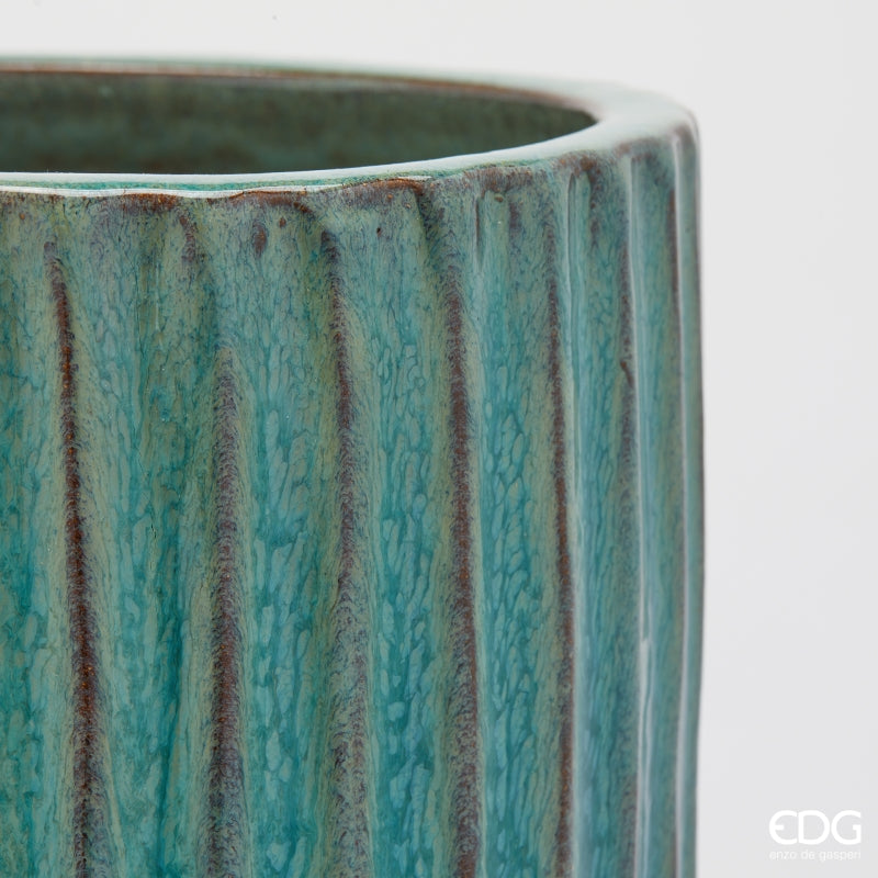 Le Set 4 Vasi Glaze Atlas Righe EDG Enzo De Gasperi Mix Blu est une solution décorative de forte personnalité, idéale pour décorer jardins, terrasses et intérieurs avec un style contemporain et élégant. La finition rainurée verticale et la finition émaillée dans les tons mix bleu donnent une profondeur matérielle et un effet chromatique raffiné.