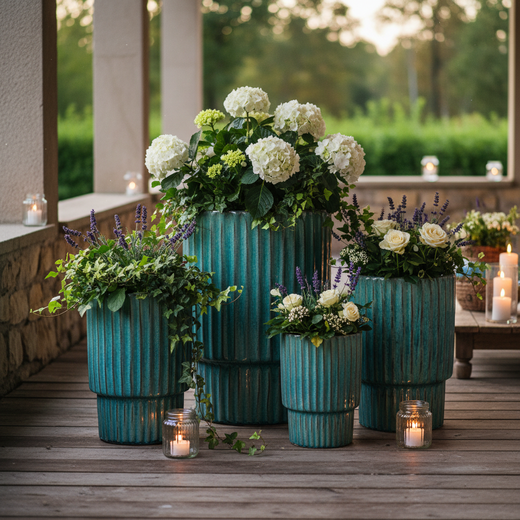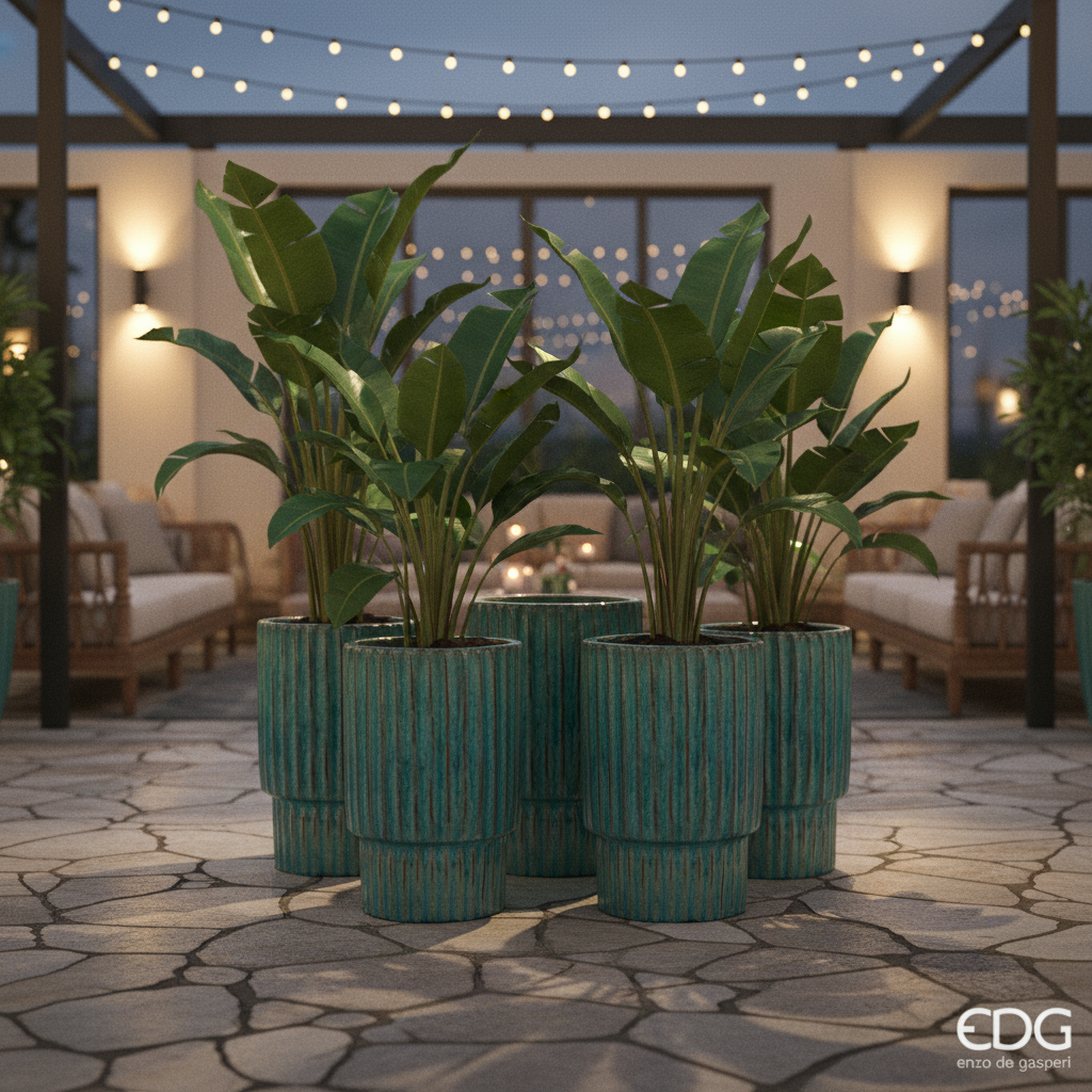 Les quatre hauteurs permettent de créer des compositions dynamiques et scénographiques, parfaites pour les plantes ornementales, les arbustes, les petits arbres ou les compositions végétales. La structure avec base surélevée et texture à rayures verticales rend ces vases idéaux pour les environnements modernes, méditerranéens ou contractuels.