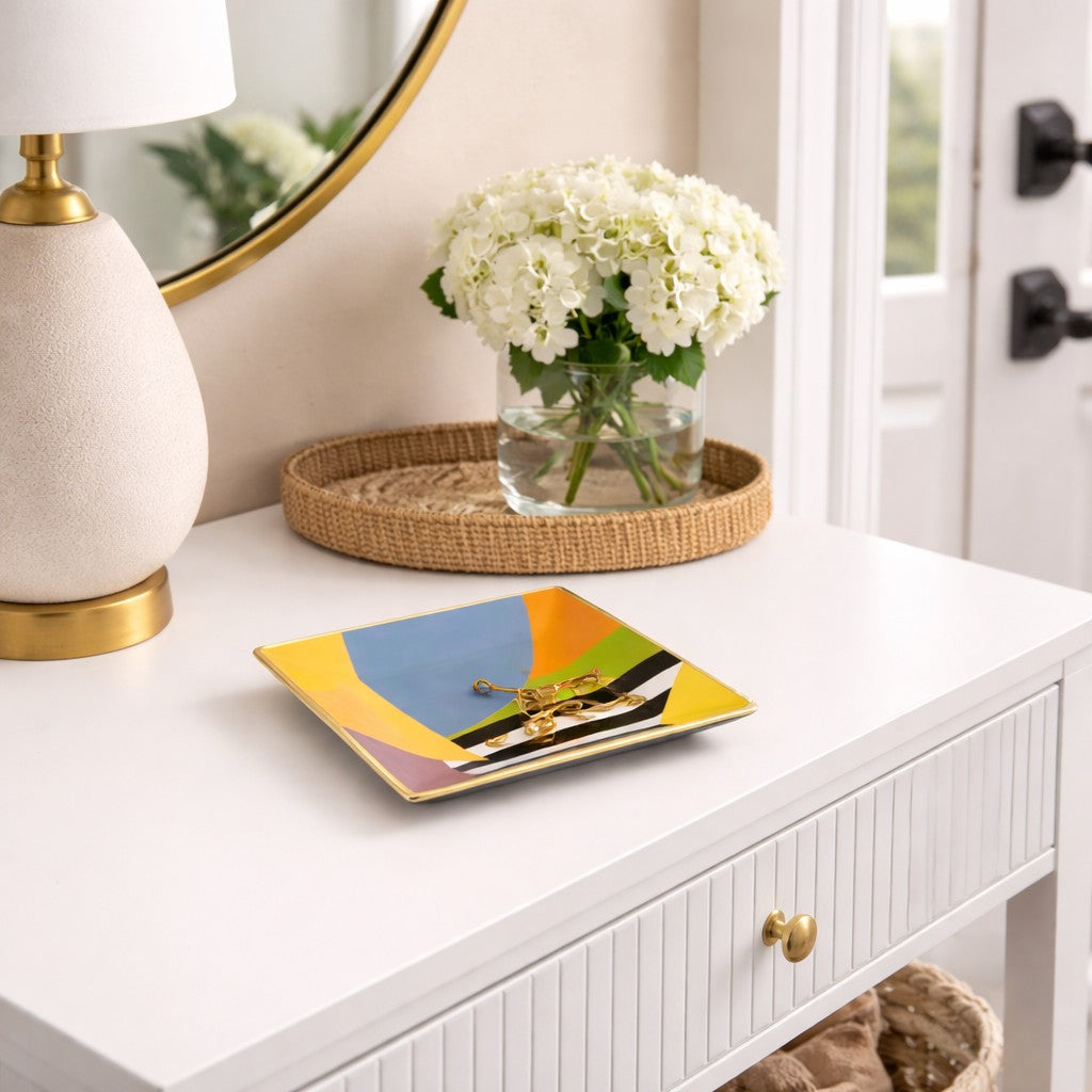 Sa forme carrée avec un bord doré lui confère raffinement et luminosité, le rendant parfait aussi bien comme accessoire fonctionnel que comme objet décoratif. D'une dimension de 24 cm, il est idéal pour être placé sur une console, une table, une entrée, un bureau ou un buffet, où il peut être utilisé pour ranger des clés, de petits objets, des bijoux ou des accessoires quotidiens.