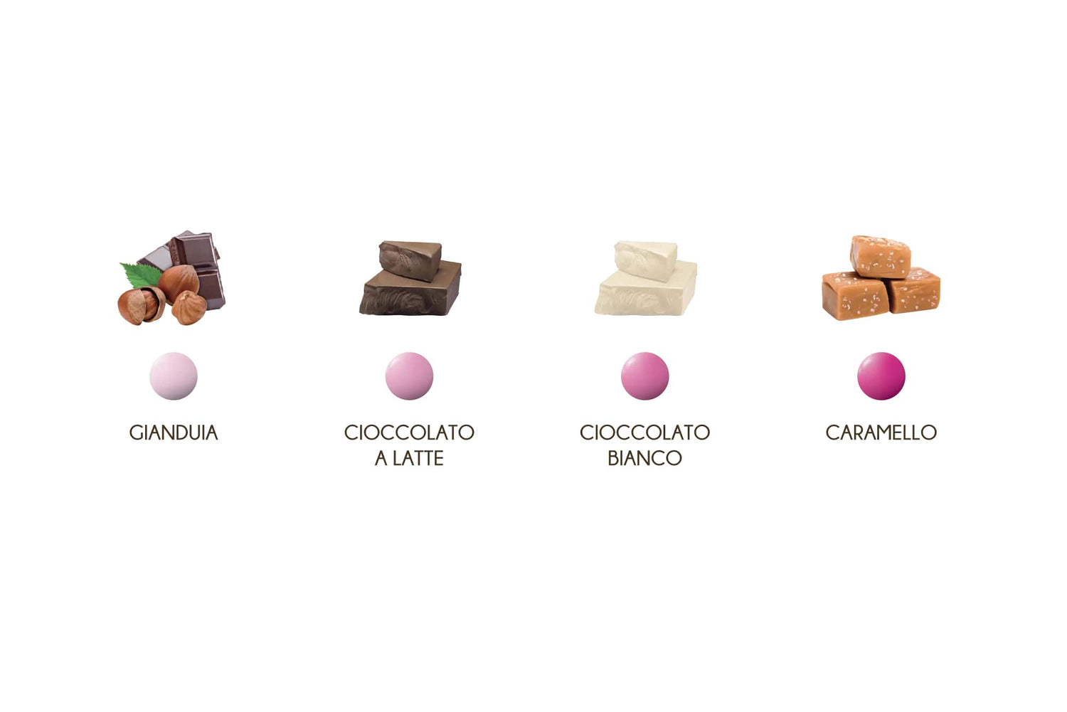 • Caramel, Chocolat Blanc, Chocolat au Lait et Gianduia