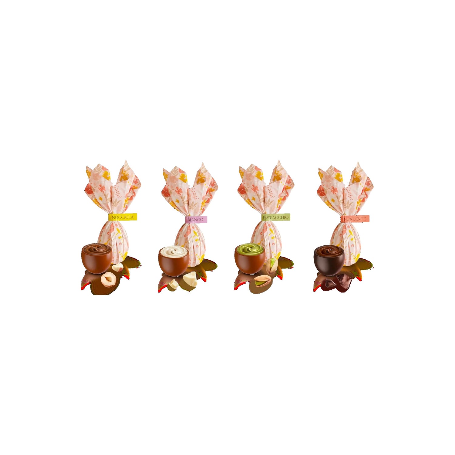4 gusti assortiti: fondente, bianco, pistacchio e nocciola