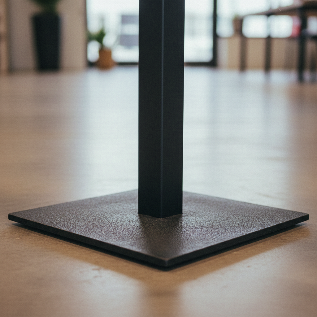 Le piètement en fonte Moia Greenwood avec pied plat de 40×40 cm et tube en acier 60×60 mm anthracite combine le poids de la fonte et la résistance de l'acier peint pour une stabilité supérieure sous tout plateau de table extérieur ou intérieur. Idéal pour les environnements contract à fort trafic, il est livré dans un emballage individuel avec vis de montage incluses pour une installation immédiate.