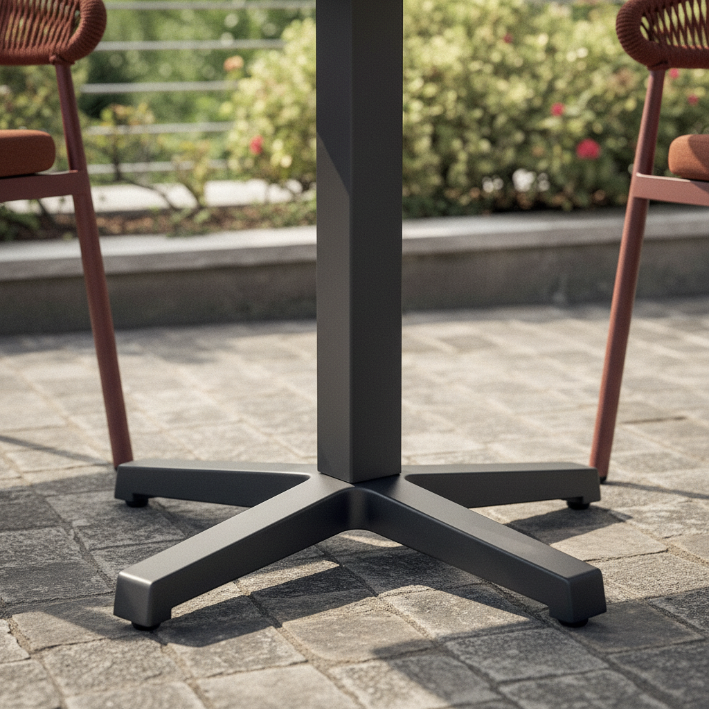 Oui : le poids de 11,5 kg, le tube de 60×60 mm et le design alourdi garantissent la stabilité nécessaire pour les tables contractuelles à fort roulement dans les restaurants, hôtels et bars extérieurs.