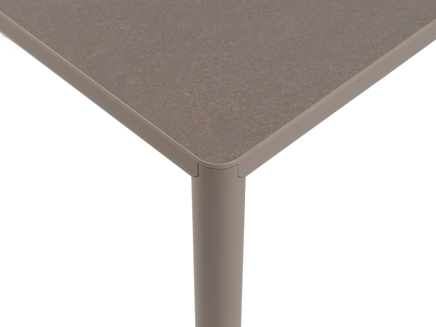 Le cadre est en aluminium peint à section ronde , un matériau léger et extrêmement résistant à la corrosion, idéal pour un usage intensif en extérieur. La finition gris tourterelle mat lui confère un aspect chaleureux et polyvalent, parfait pour les environnements extérieurs élégants et professionnels. Les pieds réglables assurent une stabilité optimale, même sur les surfaces irrégulières.