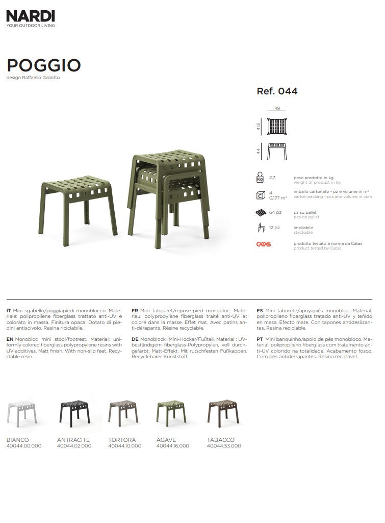 Le repose-pieds tabouret Nardi Poggio couleur Tourterelle transforme chaque coin extérieur et intérieur en un espace fonctionnel et confortable. Réalisé en polypropylène fiberglass avec traitement anti-UV, ce tabouret polyvalent de 44 cm de hauteur allie praticité et résistance aux agents atmosphériques, parfait pour les terrasses, jardins, bords de piscine et zones de détente contract. Le design compact et empilable le rend idéal comme repose-pieds pour fauteuils et chaises longues, tabouret d'appoint ou siège supplémentaire lors d'apéritifs et dîners informels, tandis que la finition mate dans la tonalité tourterelle s'intègre avec élégance dans des environnements naturels et des palettes neutres.